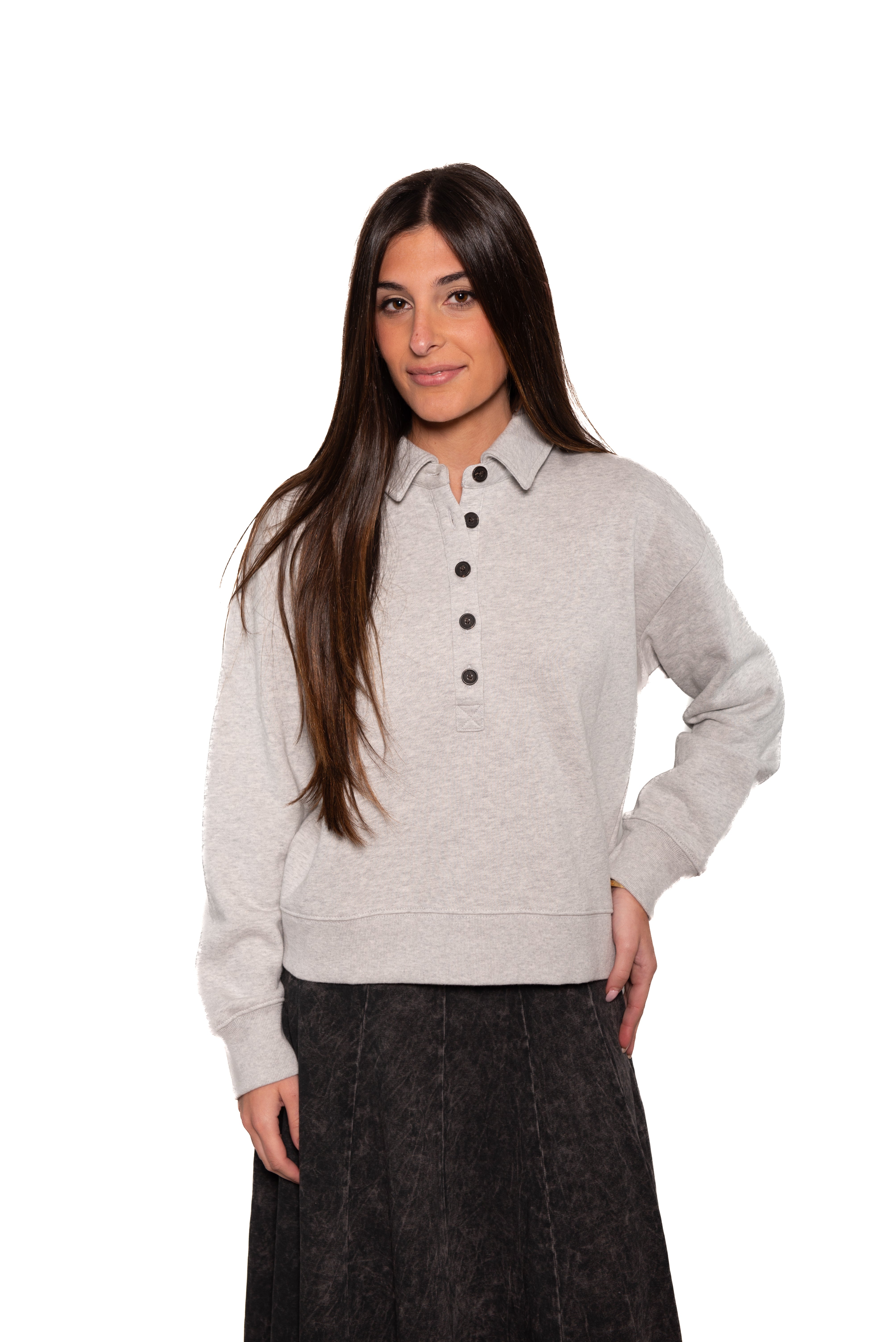 The Barlow is a polo sweatshirt featuring a button-front half placket and crafted from luxe French terry. A drop shoulder and binding at the hem and cuffs provide a comfortable, relaxed fit